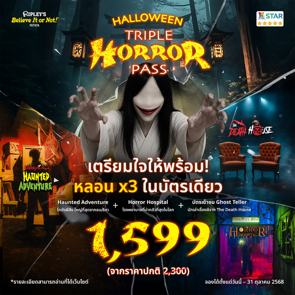 Ripley’s Halloween Festiwow Package 2025Read MoreGHOST TELLER คืนเสาร์เล่าเรื่องหลอนRead MorePromotion Back to School Adventure ClassRead MorePlayneo New Forms of Play - New AttractionRead MoreTemporary Service Closure Notice Ripley’s Moving Theater 9DX will be temporarily closed for maintenance and improvements.Read MoreDon’t miss out! Special Event at Horror Hospital – only this October!Read MorePromotion Halloween Triple Horror PassRead MoreDon’t miss out! Special Event at Horror Hospital & Haunted Adventure – only this October!Read MoreHappy Halloween Refreshment Set!Read More